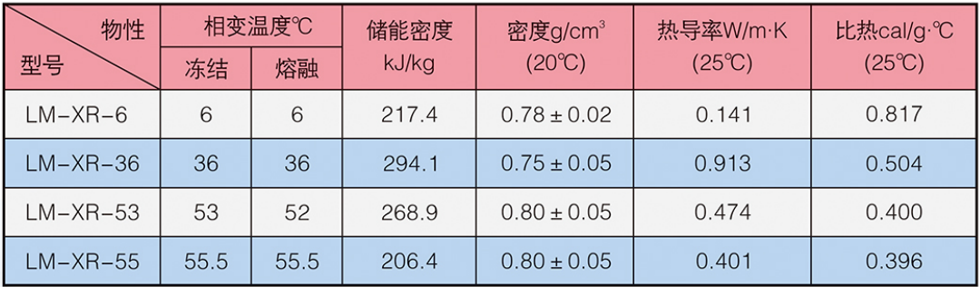 LM-XR系列產(chǎn)品由主儲(chǔ)能劑、相變調(diào)整劑、防過冷劑、防相分離劑、誘發(fā)劑等多組分復(fù)合制備而成。本品通過固-液-固相態(tài)變化實(shí)現(xiàn)熱能的儲(chǔ)存和釋放,具有較高的儲(chǔ)能密度及合適的比熱和導(dǎo)熱系數(shù)。本品不易揮發(fā)、安全可靠,可以反復(fù)使用。